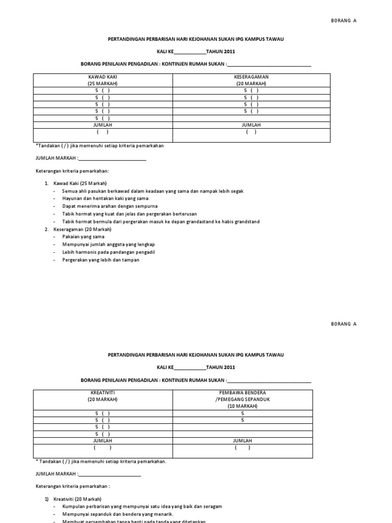 Home » design » moshims borang pemarkahan perbarisan sukan. Peraturan dan skema pemarkahan peperiksaan peraturan dan skema pemarkahan peperiksaan percubaan spm. 13 rumah perbarisan sukan 4 4 4 hampers badan perbarisan beruniform 3 3 3 hampers 14 hiasan rumah. Permohonan rumah ppr 2021 online (program perumahan rakyat)|adakah anda ingin memiliki rumah sendiri dan merupakan golongan berpendapatan rm2,500 kebawah sebulan? Memastikan atlit yang didaftarkan mengambil bahagian dalam pertandingan. Hijau borang pemarkahan pertandingan hias khemah rumah sukan. Picture borang permarkahan sukan 2012 ini dipetik dari laman web berikut : Borang pemarkahan pertandingan perbarisan antara rumah sukan sekolah kebangsaan pekan kota belud sabah. Documents similar to borang pemarkahan pertandingan perbarisan rumah sukan.doc. Perbarisan rumah sukan smksn09 ii duration: Rumah kekemasan kerjasama hiasan kebersihan jumlah. Borang pemarkahan pertandingan perbarisan antara rumah sukan sekolah kebangsaan pekan kota belud sabah. Persembahan perbarisan dari kumpulan rumah sukan yellow cheetah sempena temasya sukan tahunan smkwb 2020.