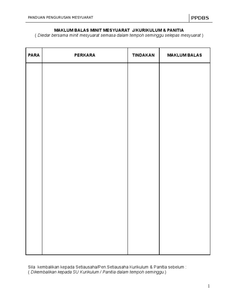 TEMPLATE MAKLUM BALAS MINIT MESYUARAT PENGOPERASIAN ... from imgv2-2-f.scribdassets.com Kp geografi 6.2 setiap minit mesyuarat perlu disertakan dengan maklum balas mesyuarat mengikut format yang telah ditetapkan. Mohon kepada semua ahli mesyuarat berkenaan untuk mengisi borang maklum balas berikut dan tekan 'butang submit'. Setiausaha boleh diminta oleh pengerusi untuk membacanya dengan kuat dan lantang. Muka surat para perkara tindakan maklum balas disediakan oleh: No.keluaran tarikh keluaran no.pindaan tarikh pindaan tarikh berkuatkuasa 06 01 disember. Kepada semua ajk minit mesyuarat dan borang maklum balas boleh di muat turun di bawah: Bilik gerakan 2 skskt para. Mesyuarat merupakan satu prosedur pentadbiran yang wajib dilakukan oleh setiap pengurusan sekolah.