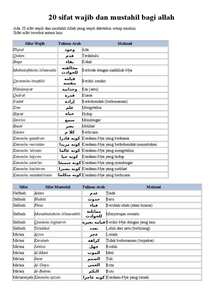 Artinya keadaannya yang bisu dan tidak berbicara. Seluruh sifat wajib bagi allah yang wajib kita ketahui jumlahnya terdapat dua puluh sifat wajib. Allah memiliki 20 sifat wajib. Savesave 20 sifat wajib dan mustahil bagi allah for later. Demikianlah pembahasan kami mengenai materi sifat wajib dan mustahil bagi nabi & rasul beserta artinya, semoga bermanfaat.