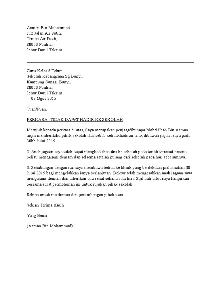 Boleh download dan ikut contoh surat tidak hadir ke sekolah ini. Surat rasmi cuti sekolah sakit pinggang, surat rasmi cuti sekolah sakit kepala, surat rasmi cuti sekolah sakit mata, surat rasmi cuti sekola. Kenapa perlu menghantar surat rasmi? (your address)guru tingkatan (your class),(school address) (date)tuan,memohon cuti sakitdengan hormatnya dimaklumkan bahawa saya, (your name), murid tingkatan(your class) tidak hadir ke sekolah pada (date) kerana (reason).2. Ketahuilah wangmu milik isterimu tapi wang via sehinggit.blogspot.com.