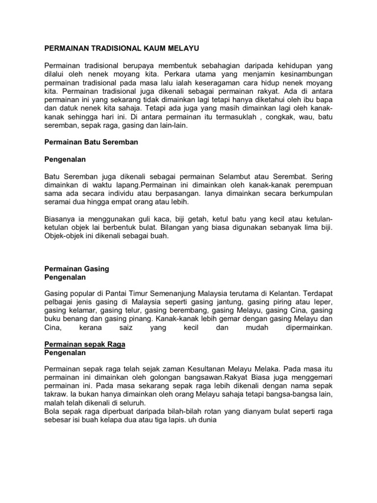 Gasing merupakan permainan tradisional orang melayu sejak dahulu. Untuk memainkan ini kamu harus mengumpulkan lebih dari dua orang. Permainan tradisional yang pertama adalah petak umpet. Menurut kamus besar bahasa indonesia (kbbi) arti kata main adalah tujuan orang bermain adalah untuk mencari kesenangan. Permainan tradisional melayu cikgu saliza teh cikgu rosmini selamat.
